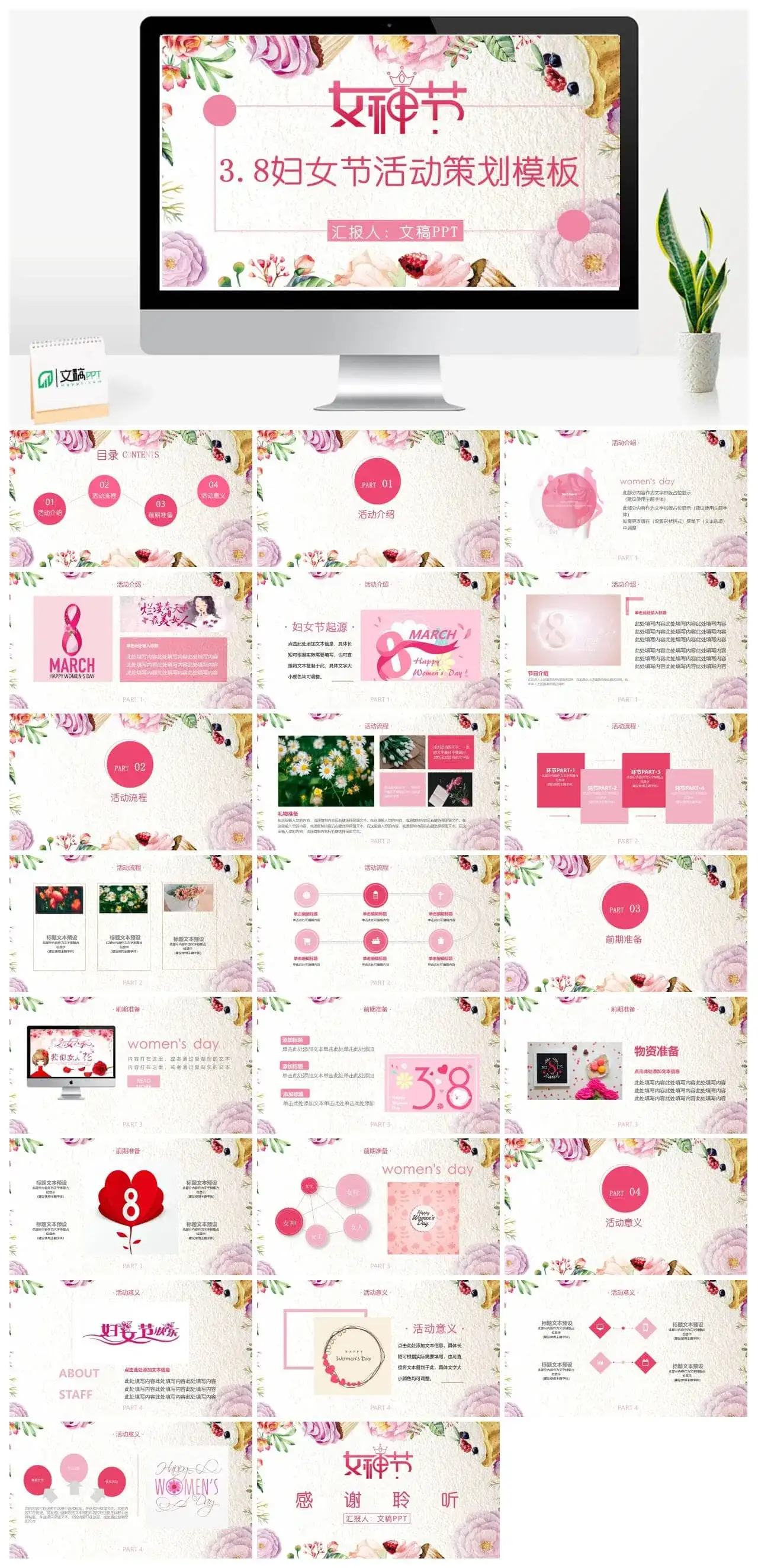 这是一套经过精心筛选关于“3.8妇女节活动策划PPT模板”主题可免费下载的精品PPT模板,模板总共包含24个精致PPT页面。本模板属于:妇女节分类,模板设计精心、创意、高端,适用于【节日PPT模板】【粉色PPT模板】相关主题PPT制作的模板
