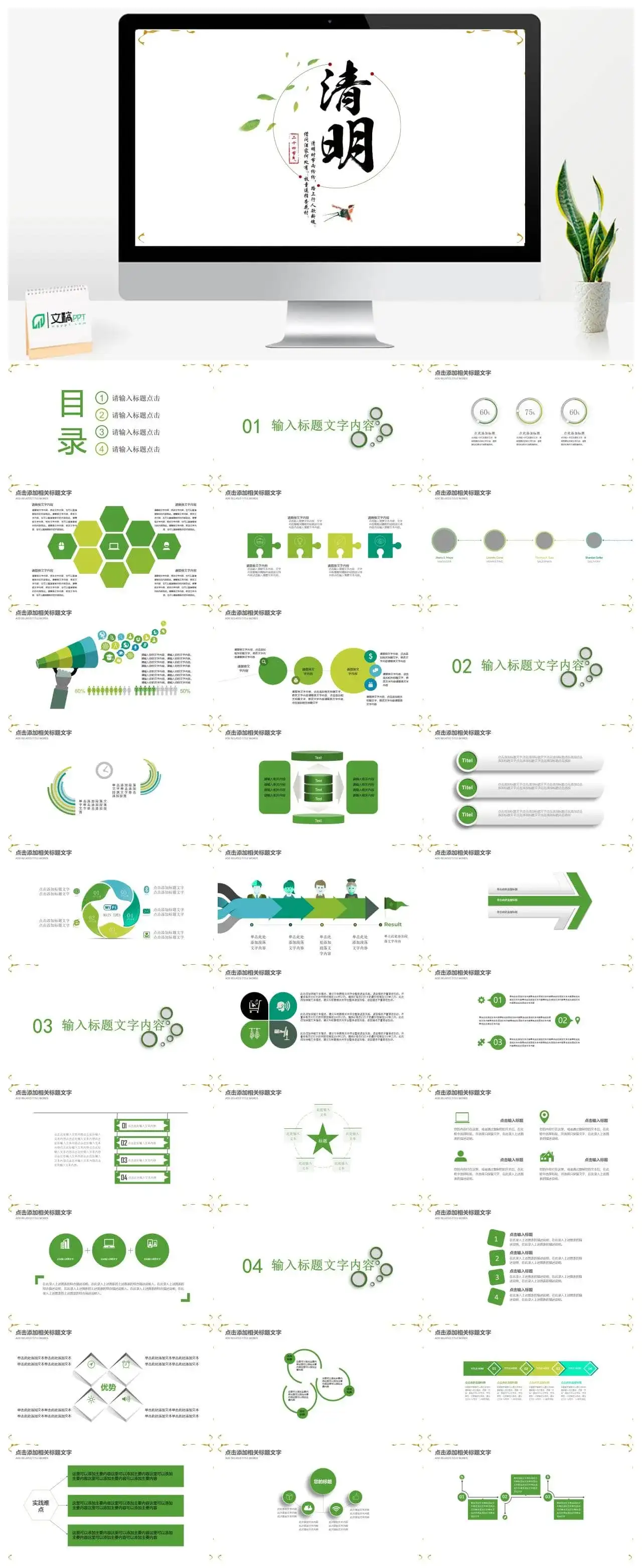 这是一套经过精心筛选关于“二十四节气清明节教育培训PPT模板”主题可免费下载的精品PPT模板,模板总共包含31个精致PPT页面。本模板属于:清明节分类,模板设计精心、创意、高端,适用于【教育培训PPT】【节日PPT模板】【绿色PPT模板】相关主题PPT制作的模板