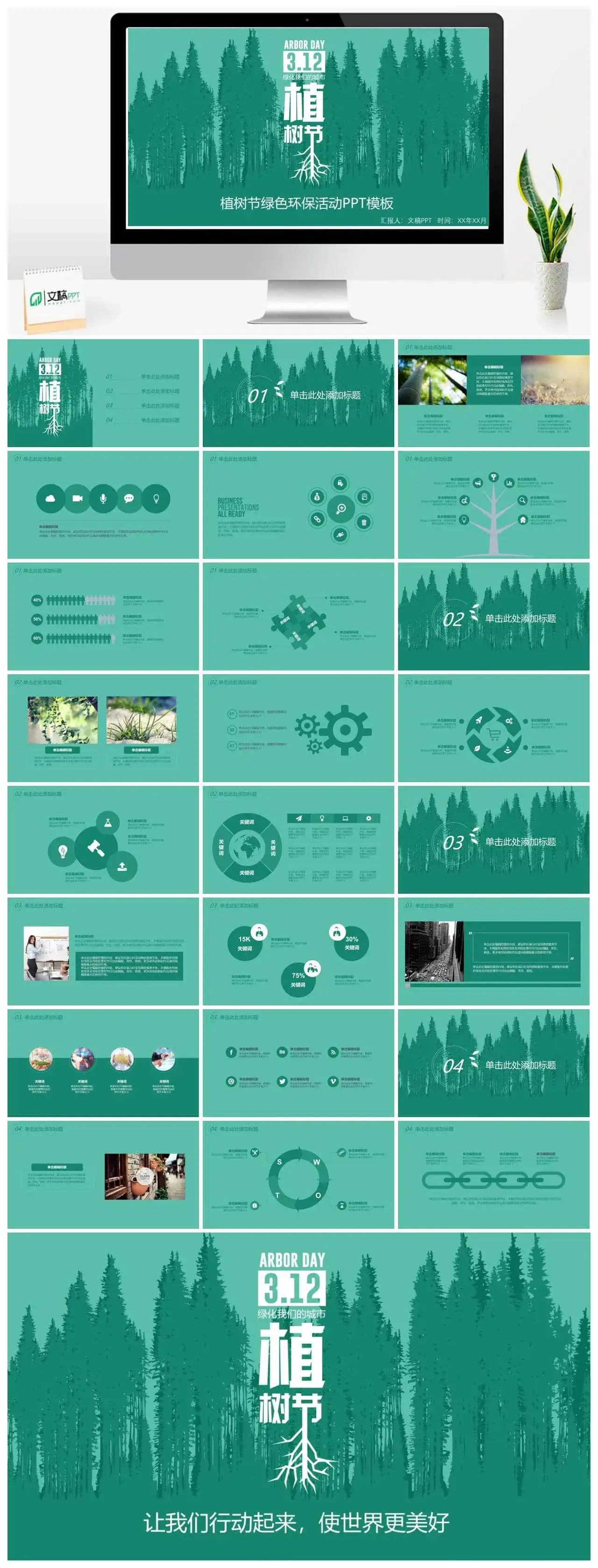 这是一套经过精心筛选关于“植树节绿色环保宣传活动PPT模板”主题可免费下载的精品PPT模板,模板总共包含26个精致PPT页面。本模板属于:植树节分类,模板设计精心、创意、高端,适用于【节日PPT模板】【绿色PPT模板】相关主题PPT制作的模板