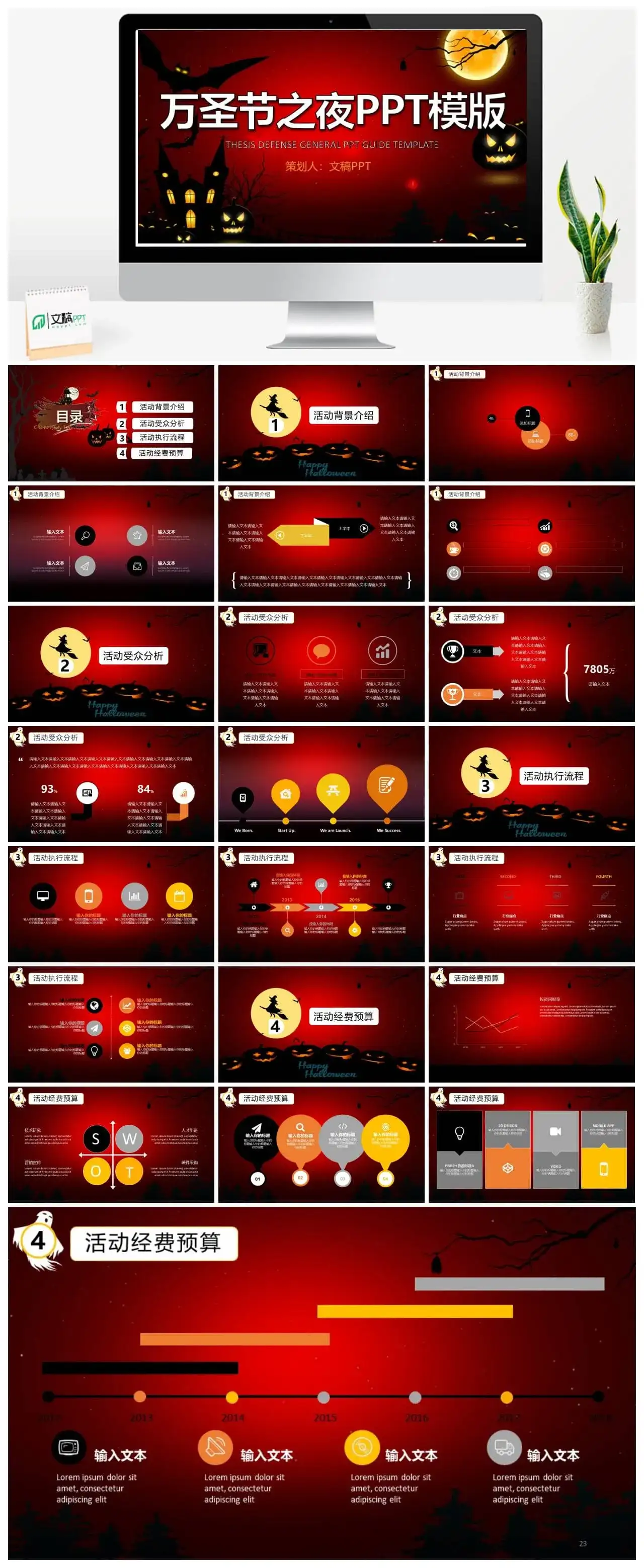 这是一套经过精心筛选关于“万圣节之夜狂欢派对活动策划PPT模板”主题可免费下载的精品PPT模板,模板总共包含23个精致PPT页面。本模板属于:万圣节分类,模板设计精心、创意、高端,适用于【节日PPT模板】【红色PPT模板】相关主题PPT制作的模板