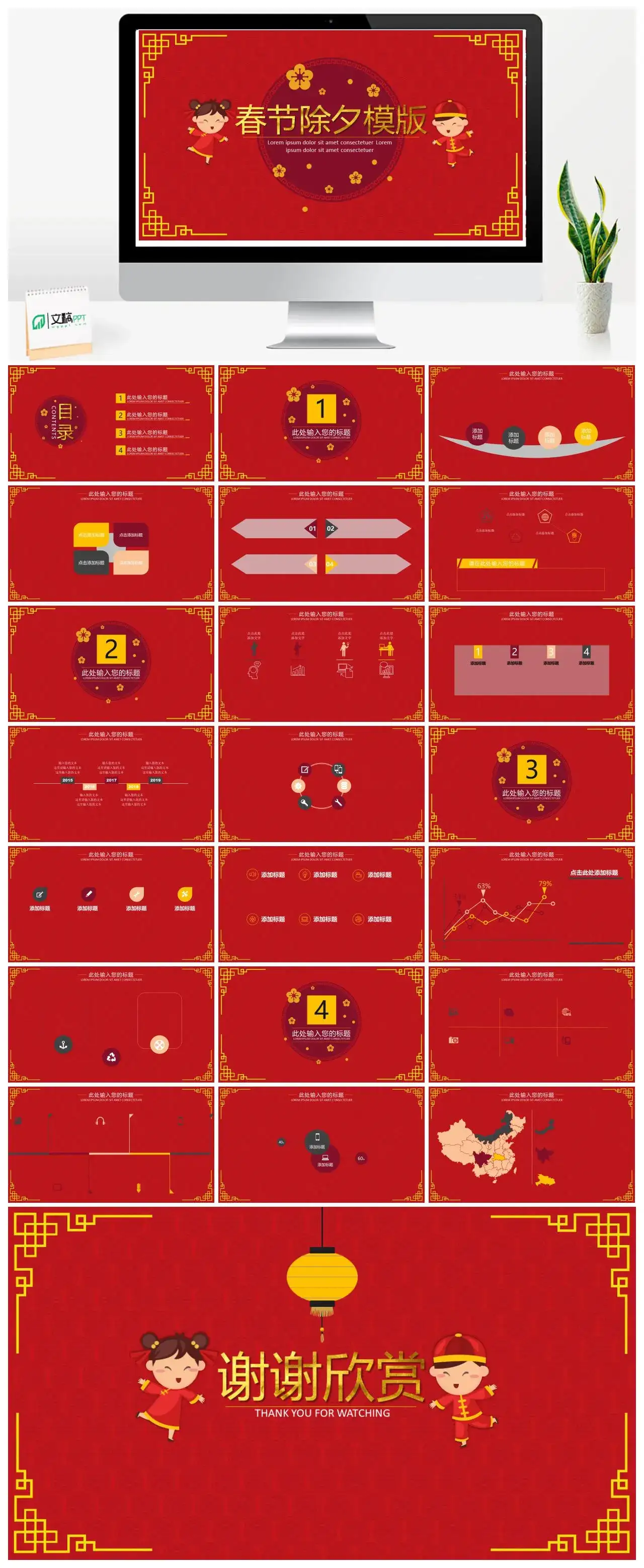 这是一套经过精心筛选关于“节日庆典春节除夕PPT模板”主题可免费下载的精品PPT模板,模板总共包含23个精致PPT页面。本模板属于:新春节分类,模板设计精心、创意、高端,适用于【红色PPT模板】【节日PPT模板】相关主题PPT制作的模板