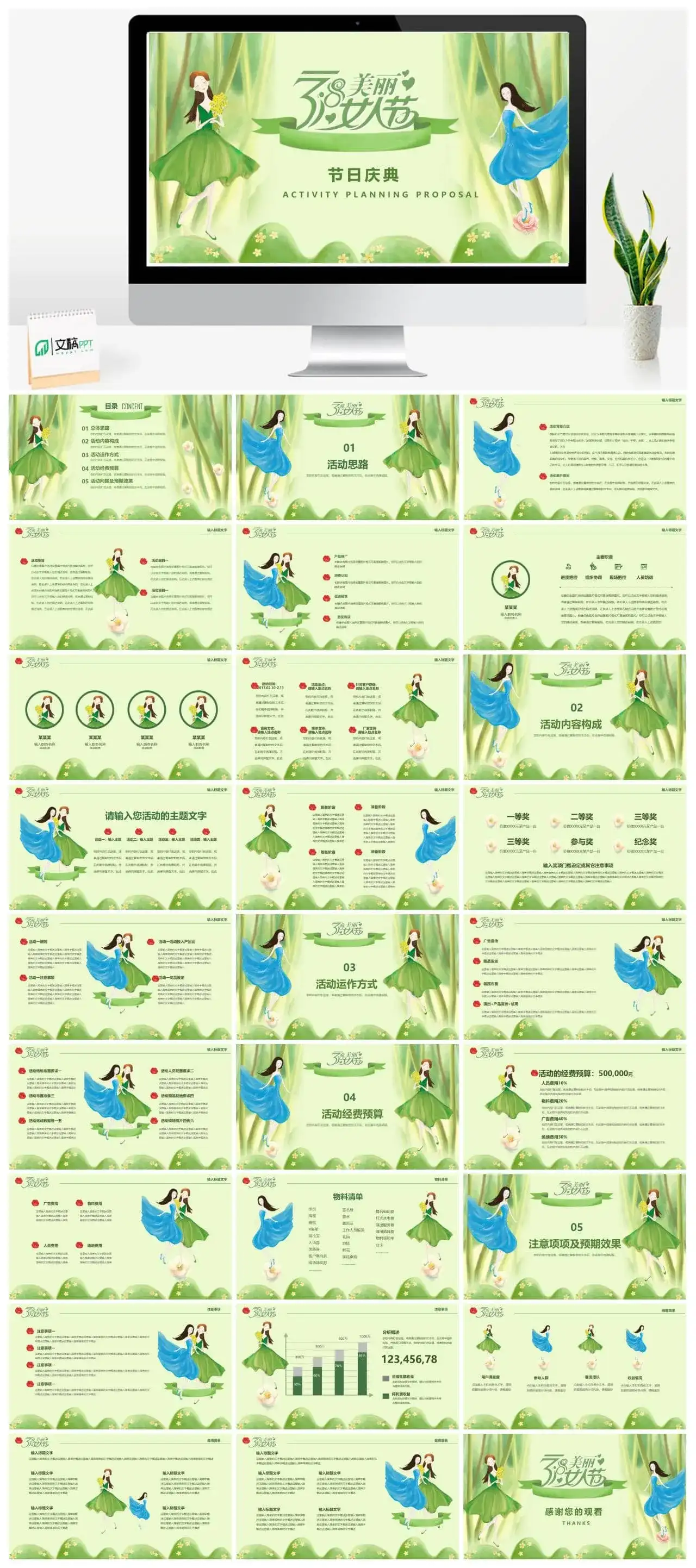 这是一套经过精心筛选关于“三八妇女节活动策划PPT模板”主题可免费下载的精品PPT模板,模板总共包含28个精致PPT页面。本模板属于:妇女节分类,模板设计精心、创意、高端,适用于【节日PPT模板】【绿色PPT模板】相关主题PPT制作的模板