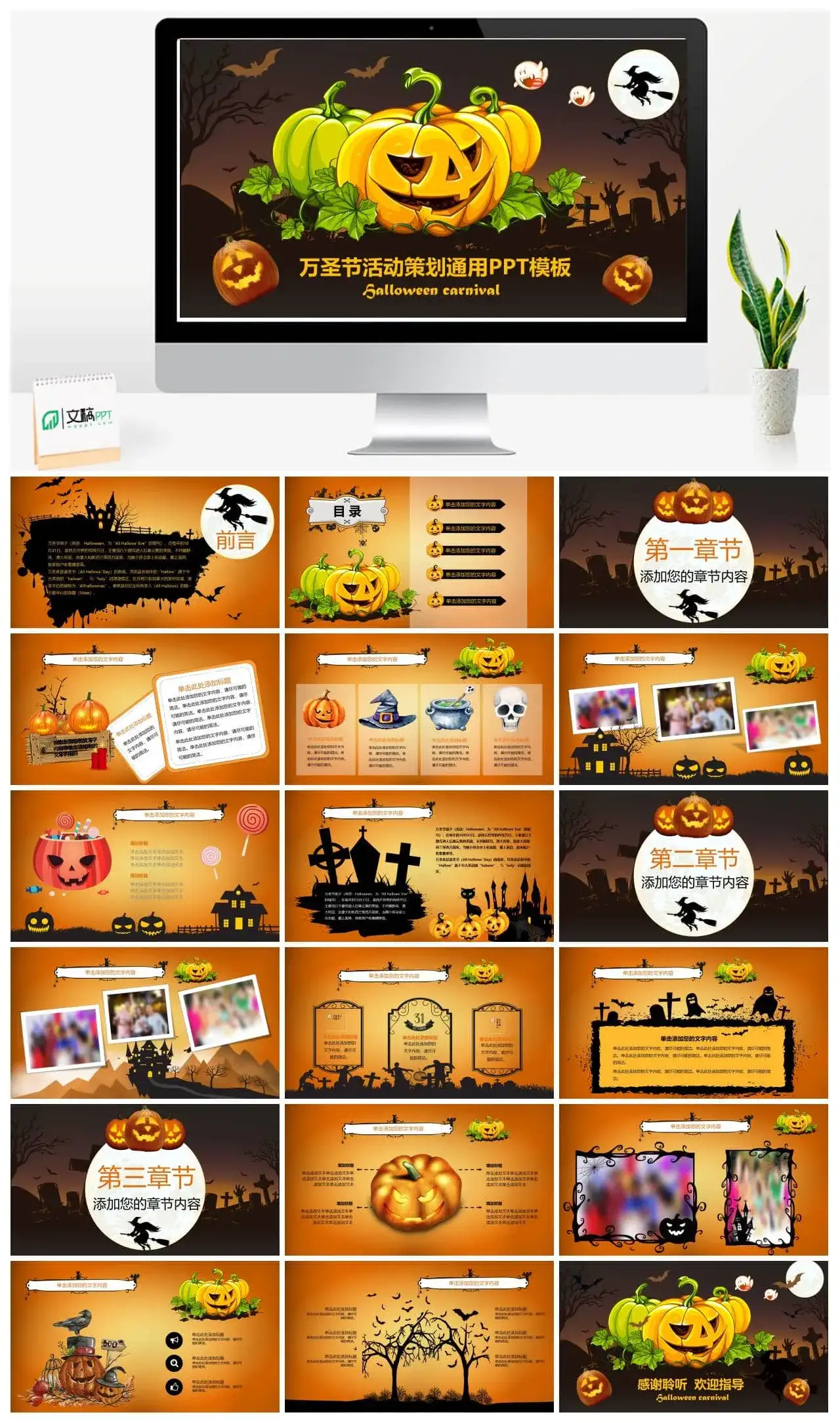 这是一套经过精心筛选关于“恐怖南瓜灯万圣节PPT模板”主题可免费下载的精品PPT模板,模板总共包含19个精致PPT页面。本模板属于:万圣节分类,模板设计精心、创意、高端,适用于【节日PPT模板】【黄色PPT模板】【黑色PPT模板】相关主题PPT制作的模板