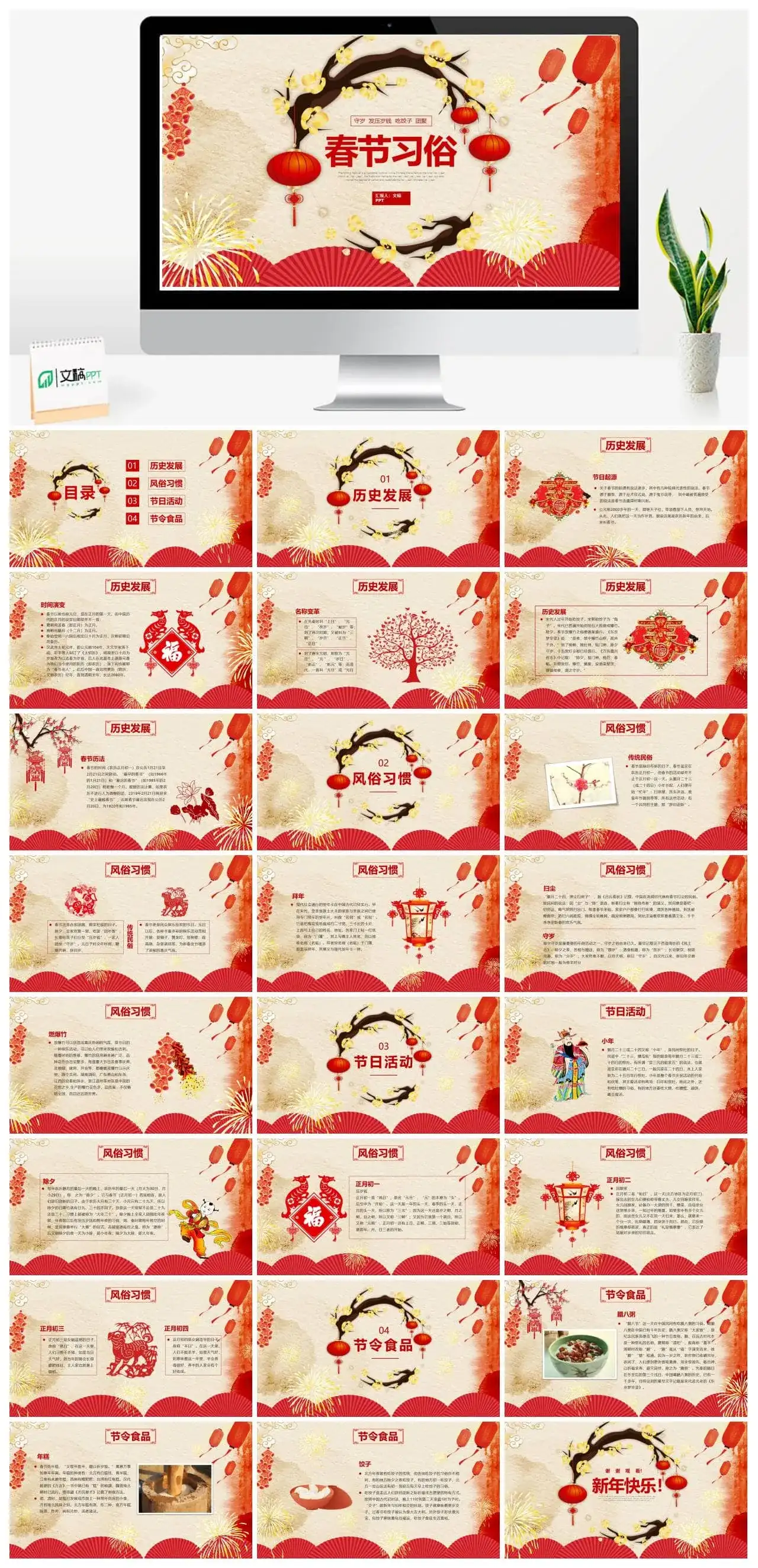 这是一套经过精心筛选关于“春节传统习俗介绍PPT模板”主题可免费下载的精品PPT模板,模板总共包含25个精致PPT页面。本模板属于:新春节分类,模板设计精心、创意、高端,适用于【节日PPT模板】【红色PPT模板】相关主题PPT制作的模板
