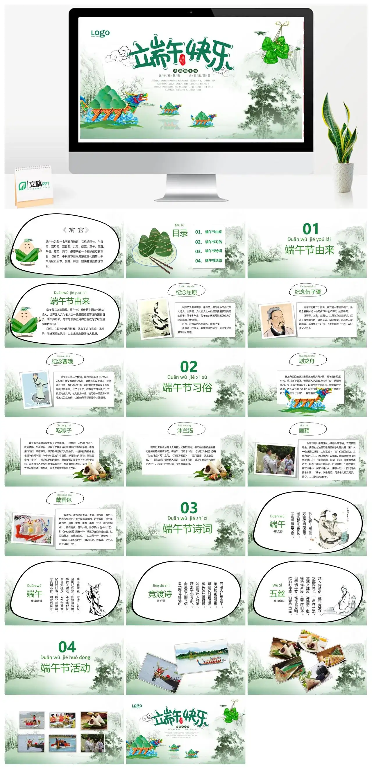 这是一套经过精心筛选关于“龙舟粽子端午节快乐PPT模板”主题可免费下载的精品PPT模板,模板总共包含24个精致PPT页面。本模板属于:端午节分类,模板设计精心、创意、高端,适用于【节日PPT模板】【绿色PPT模板】相关主题PPT制作的模板