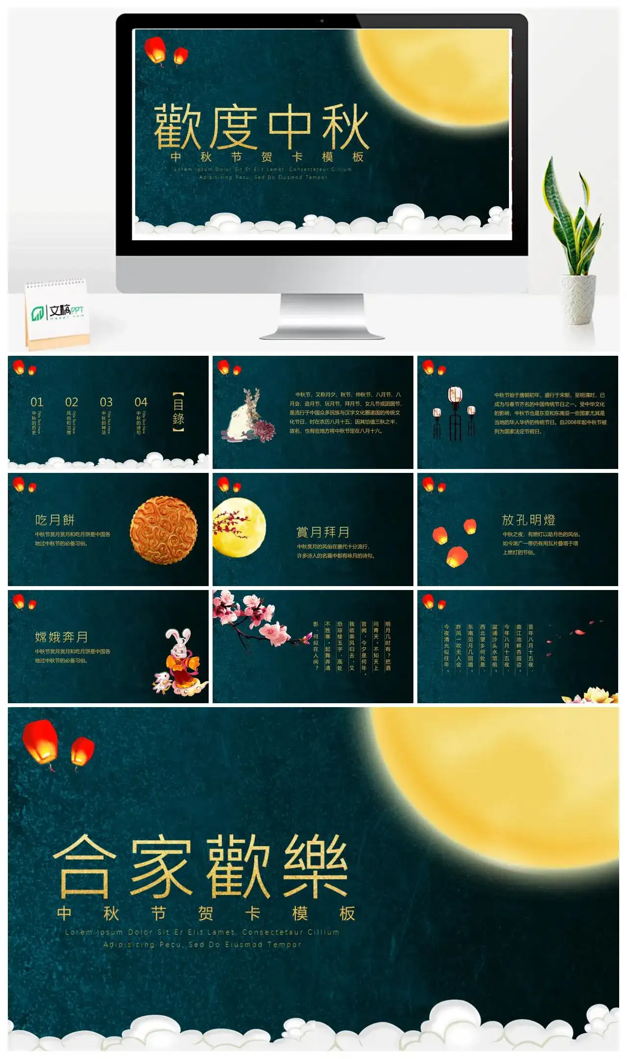 这是一套经过精心筛选关于“阖家欢乐欢度中秋PPT模板”主题可免费下载的精品PPT模板,模板总共包含11个精致PPT页面。本模板属于:中秋节分类,模板设计精心、创意、高端,适用于【节日PPT模板】【蓝色PPT模板】【黄色PPT模板】相关主题PPT制作的模板