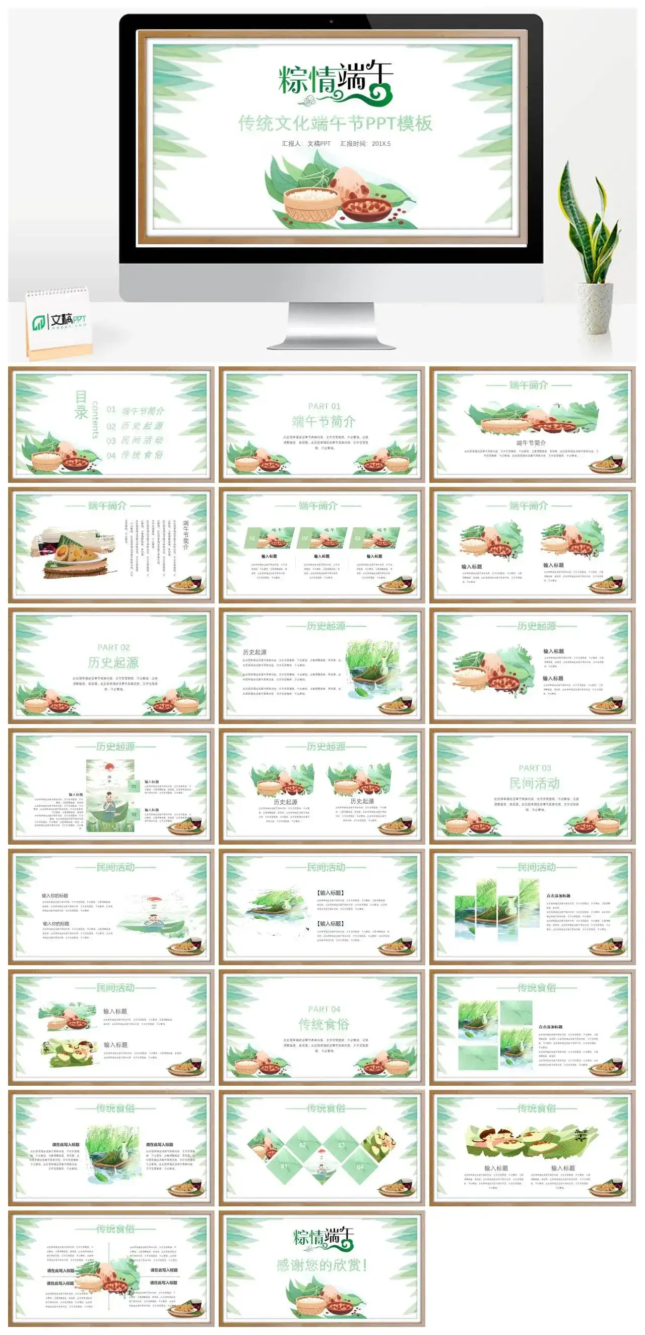 这是一套经过精心筛选关于“传统文化端午节PPT模板”主题可免费下载的精品PPT模板,模板总共包含24个精致PPT页面。本模板属于:端午节分类,模板设计精心、创意、高端,适用于【节日PPT模板】【绿色PPT模板】相关主题PPT制作的模板
