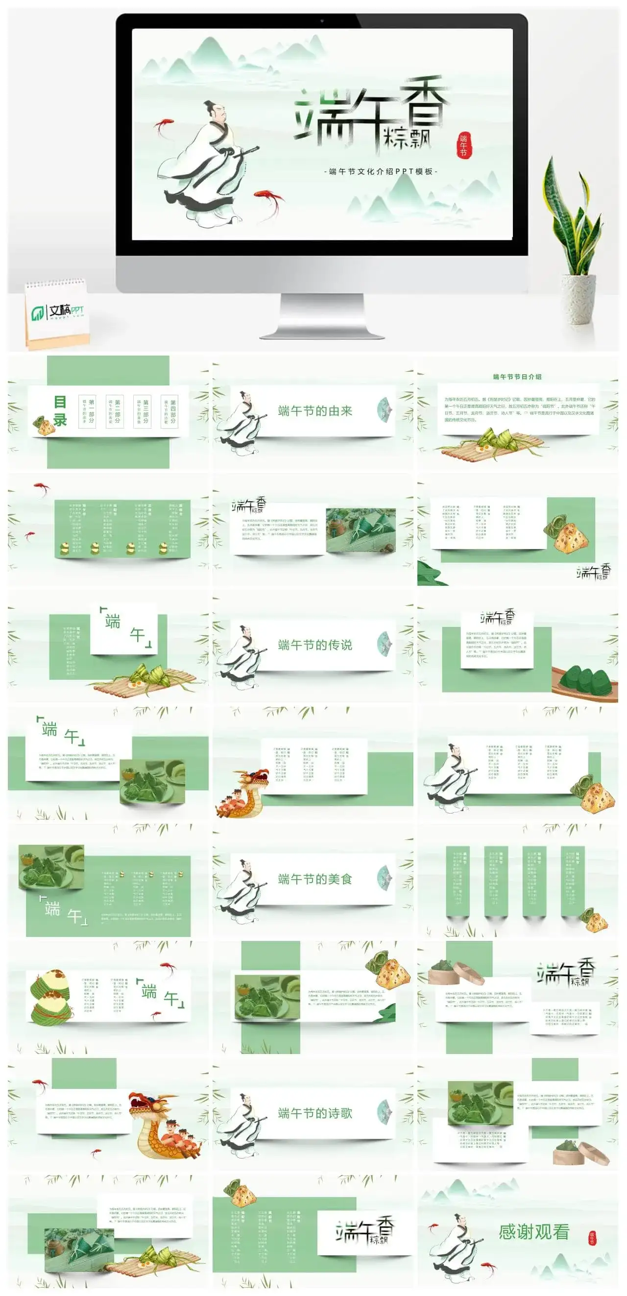 这是一套经过精心筛选关于“屈原背景端午节PPT模板下载”主题可免费下载的精品PPT模板,模板总共包含25个精致PPT页面。本模板属于:端午节分类,模板设计精心、创意、高端,适用于【节日PPT模板】【绿色PPT模板】相关主题PPT制作的模板