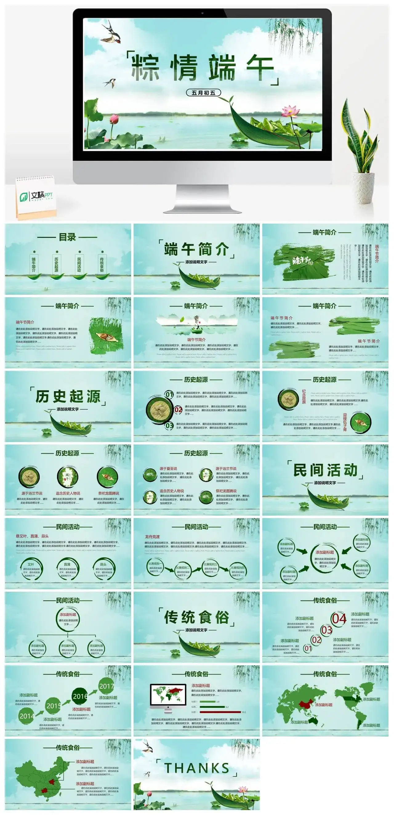 这是一套经过精心筛选关于“传统节日端午佳节PPT模板”主题可免费下载的精品PPT模板,模板总共包含24个精致PPT页面。本模板属于:端午节分类,模板设计精心、创意、高端,适用于【节日PPT模板】【绿色PPT模板】相关主题PPT制作的模板