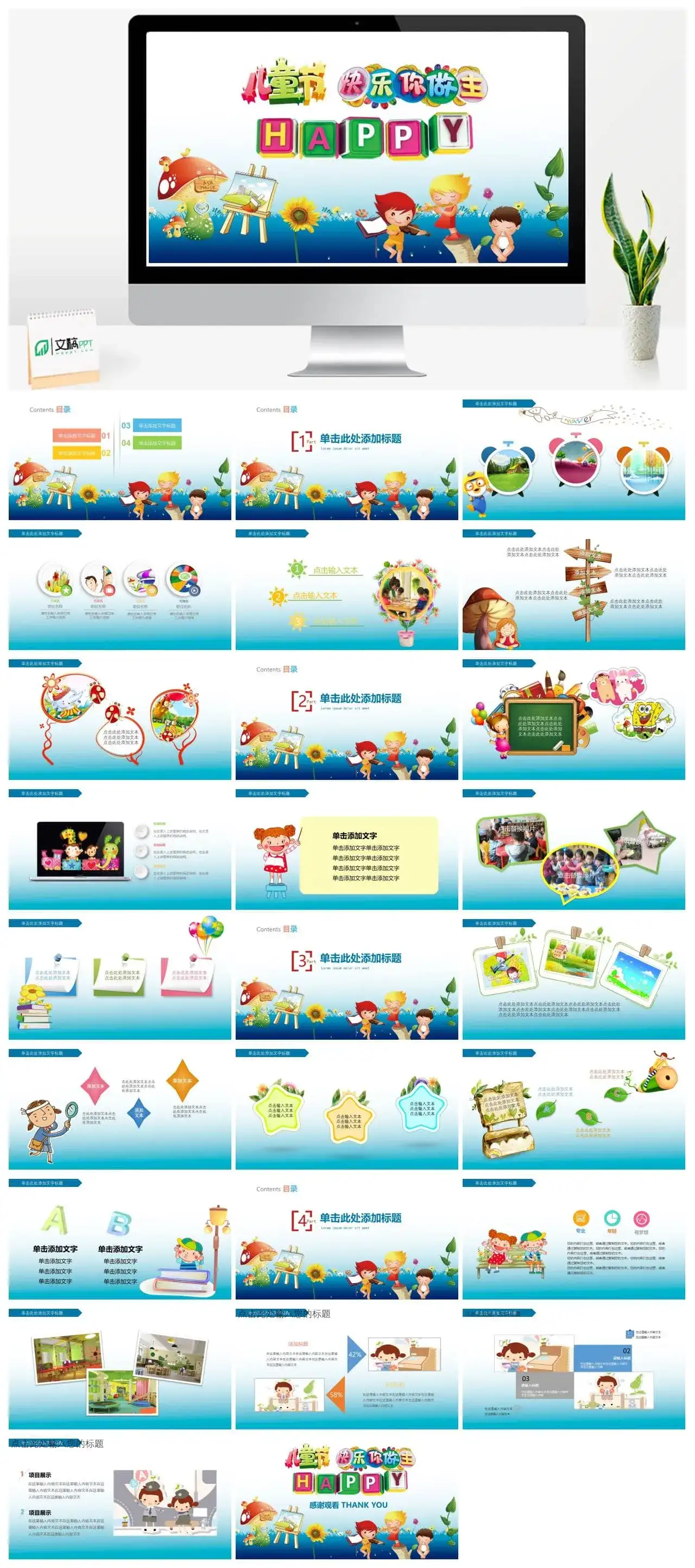 这是一套经过精心筛选关于“欢乐儿童节PowerPoint模板”主题可免费下载的精品PPT模板,模板总共包含27个精致PPT页面。本模板属于:儿童节分类,模板设计精心、创意、高端,适用于【节日PPT模板】【彩色PPT模板】相关主题PPT制作的模板