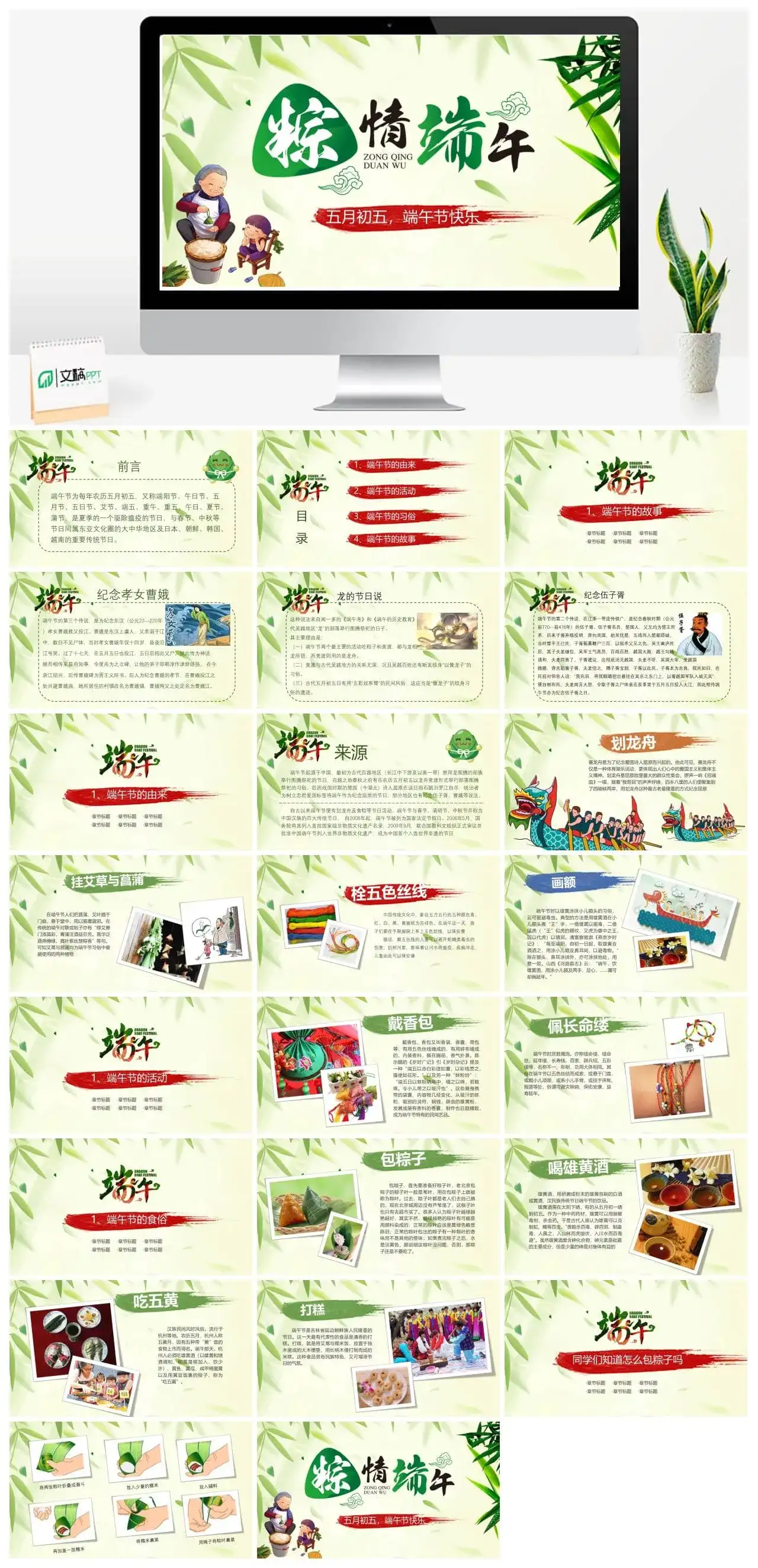 这是一套经过精心筛选关于“五月初五端午节PPT模板”主题可免费下载的精品PPT模板,模板总共包含24个精致PPT页面。本模板属于:端午节分类,模板设计精心、创意、高端,适用于【节日PPT模板】【绿色PPT模板】相关主题PPT制作的模板